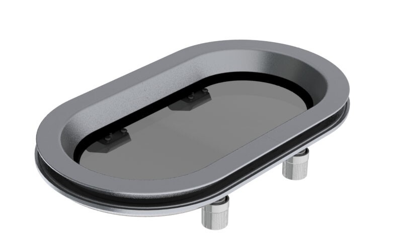 These portholes are suitable for use in the coachroof side. They come with a 10 mm ‘smoke’ coloured –unframed- opening pane. The clamp type installation ensures that no fasteners are visible from either inside or outside.The portholes can be held open in any position due to the friction type hinges. In closed position 2 knobs ensure water resistance. The are standard supplied with a mosquito screen.The porthole can be fitted in a surface with a minimum thickness of 2 mm and a maximum thickness of 18 mm. The first image is one version of our PM portholes. The portholes differ in shape the number of hinges and handles and the type of mosquito screen. This information can be found in the additional information.